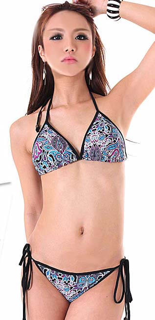 大人っぽいペイズリー柄ビキニ、ブラックストラップが効いています